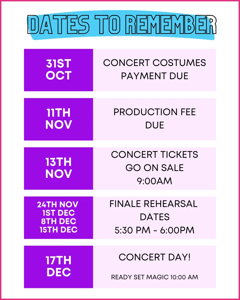 If there is any reason why your child will not be able to perform at the concert on the dates and times provided, please let us know so we can make amendments to the class routines involving them.